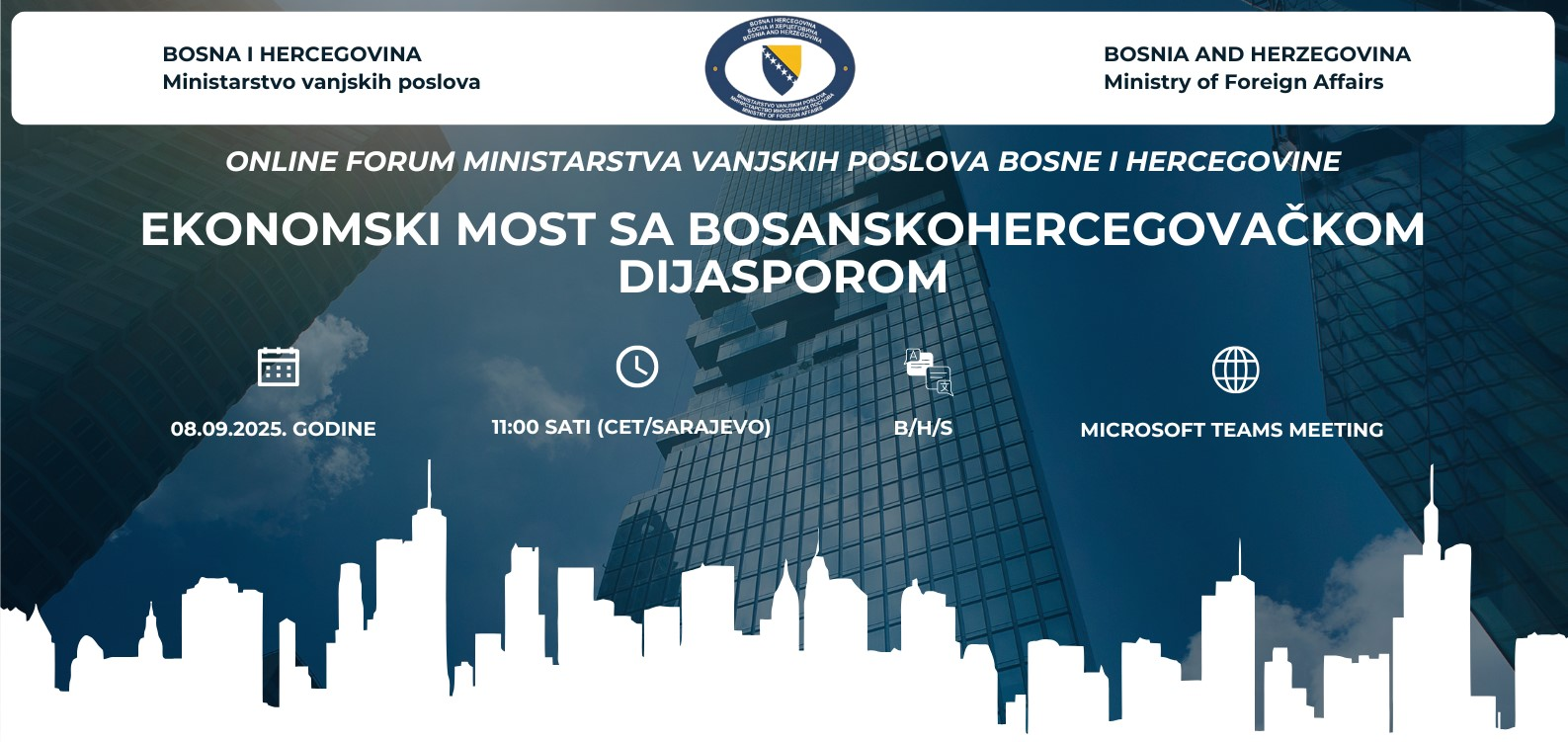 Ministarstvo vanjskih poslova Bosne i Hercegovine organiziralo je danas prvi online forum pod nazivom “Ekonomski most sa bosanskohercegovačkom dijasporom”, s ciljem povezivanja i mapiranja relevantnih poslovnih udruženja, komora, klubova, inicijativa i drugih organizacija iz bh. dijaspore širom svijeta.